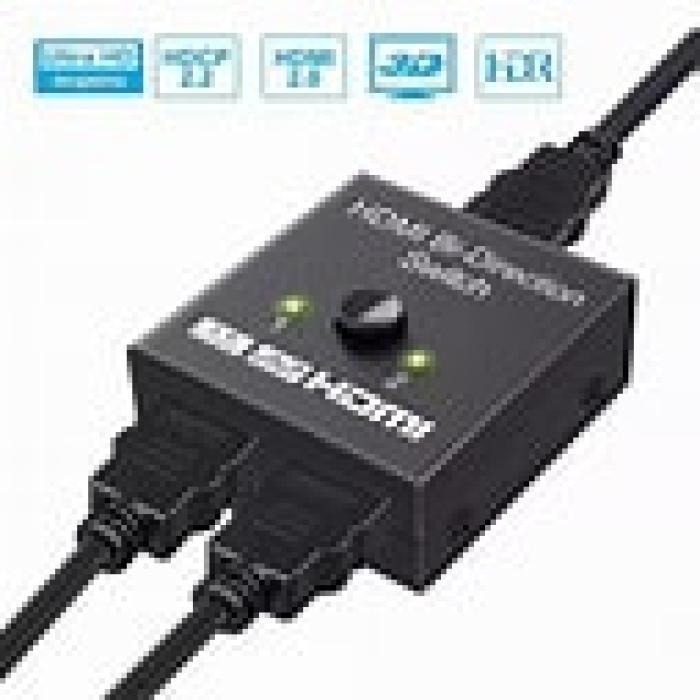 Compact HDMI Bi‑Direction Switch that lets you connect two HDMI sources to one display or one source to two displays with support for up to 4K @ 60 Hz, HDR, and HDCP 2.2 compatibility — making switching between devices simple and convenient.